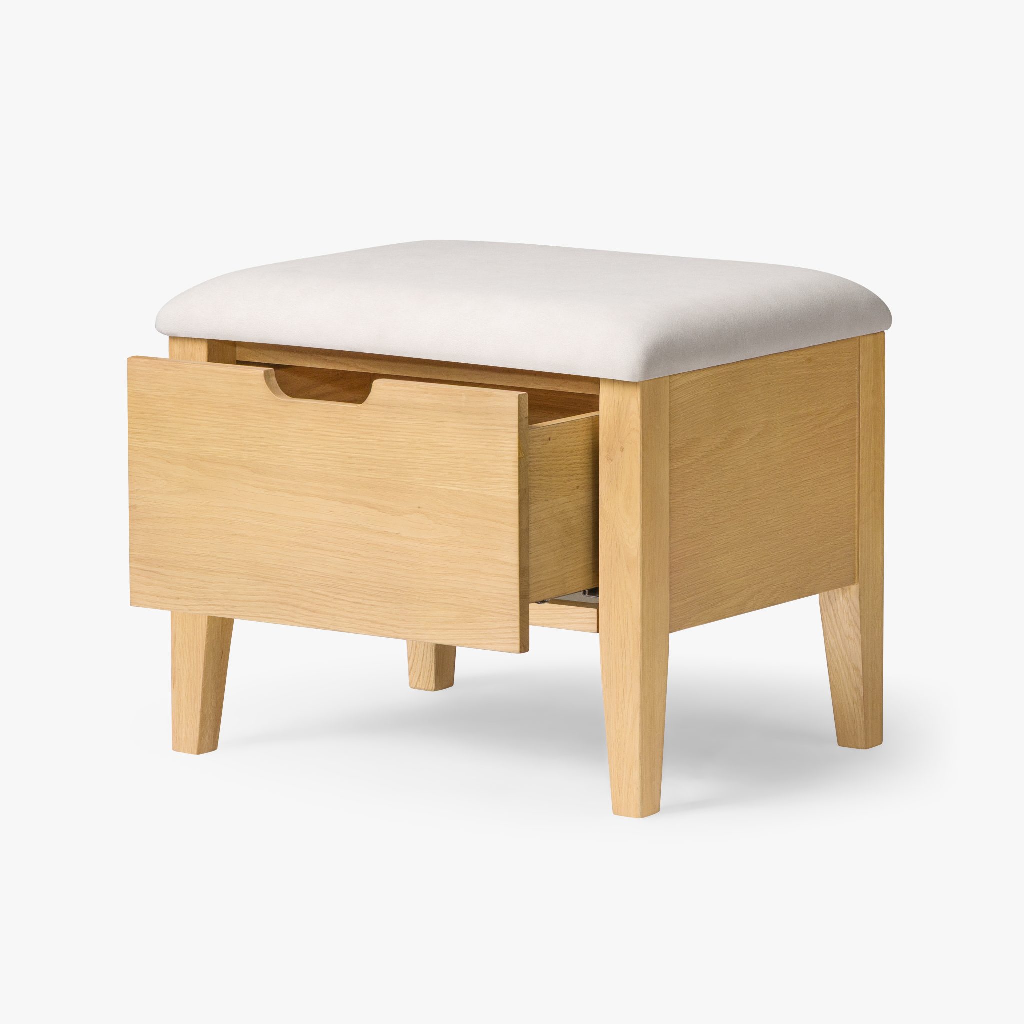 Gefertigt aus europäischer Eiche und matt lackiert, bietet die Oberfläche Schutz und eine angenehme Haptik. Das Polster ist komfortabel, die Klappe leicht bedienbar. Präzise Kanten und sauber gefügte Flächen unterstreichen die Qualität.