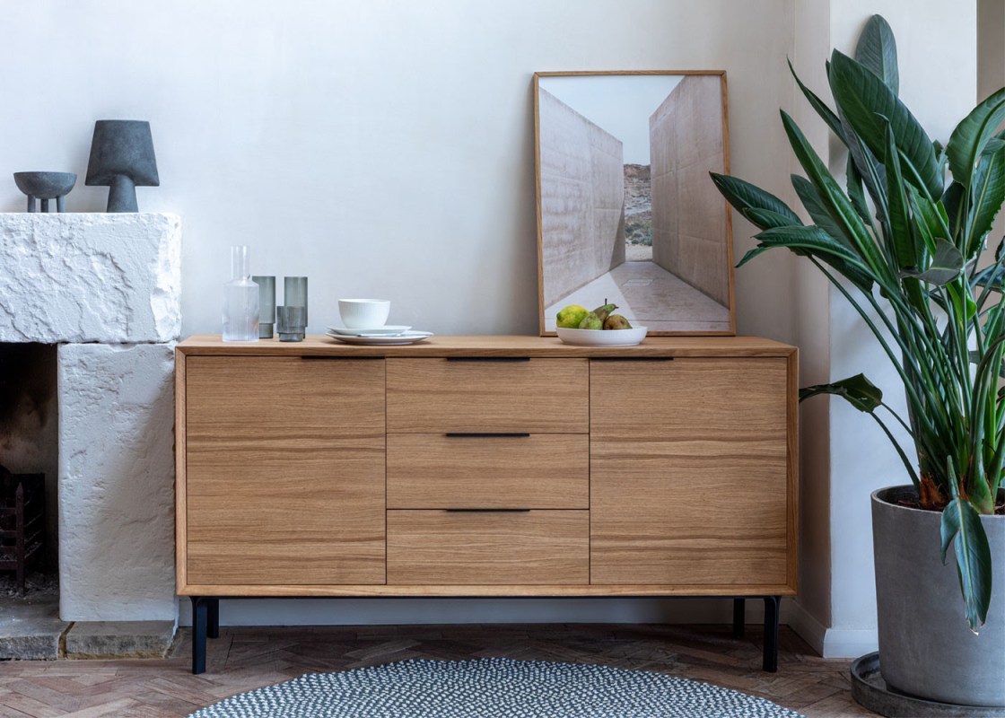 Die moderne, trendige Bergen Kommode kombiniert klare Linien mit der warmen Ausstrahlung von Eichenholz. Durch ihr zeitloses, ruhiges Erscheinungsbild fügt sie sich harmonisch in Wohn- und Schlafzimmer ein und setzt zugleich die natürliche Maserung der Eiche elegant in Szene.
