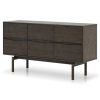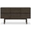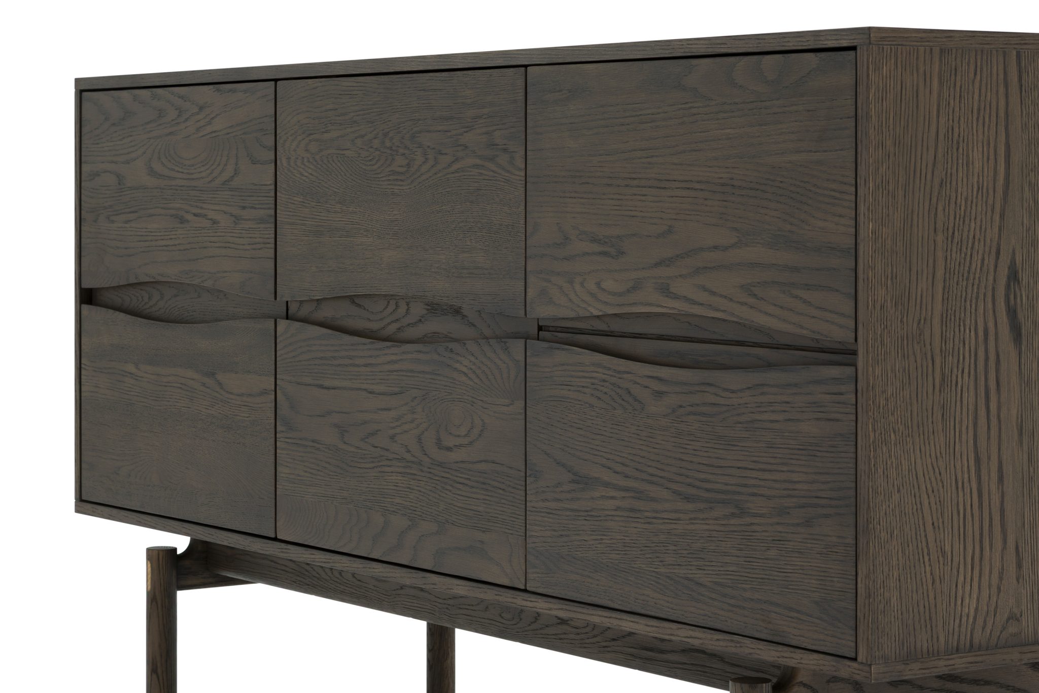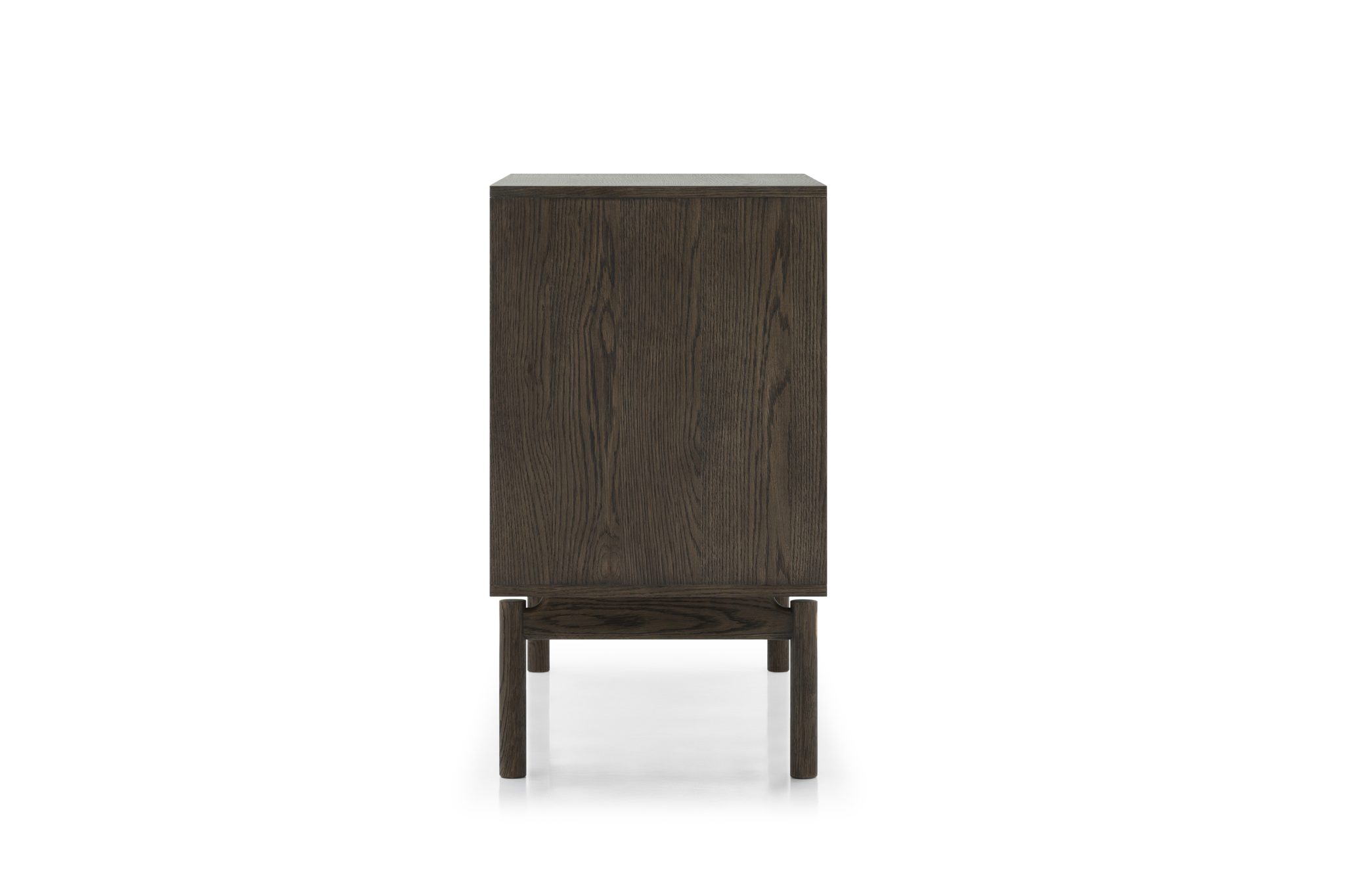 Fronten und Türpaneele bestehen aus massivem Eichenholz und zeigen die markante Maserung der Eiche – jedes Stück ist ein Unikat. Handgearbeitete Eichenholzfüße mit hohem Profil sorgen für Stabilität und erleichtern die Reinigung mit dem Staubsauger. Das hochwertige Finish in Espresso-Lack bietet hervorragenden Schutz gegen Kratzer, Feuchtigkeit und alltägliche Abnutzung.