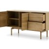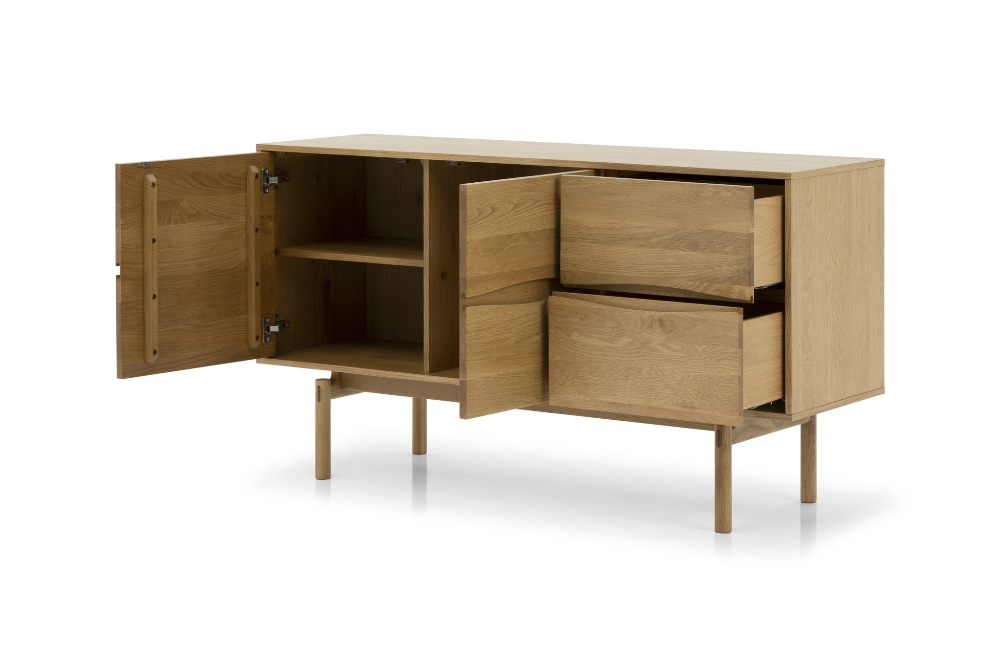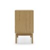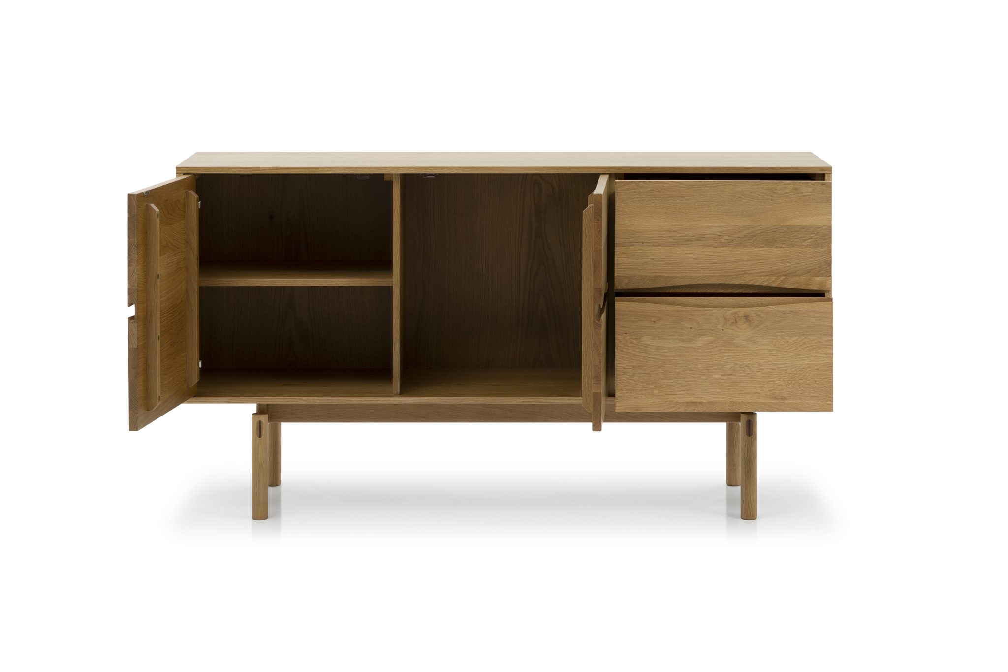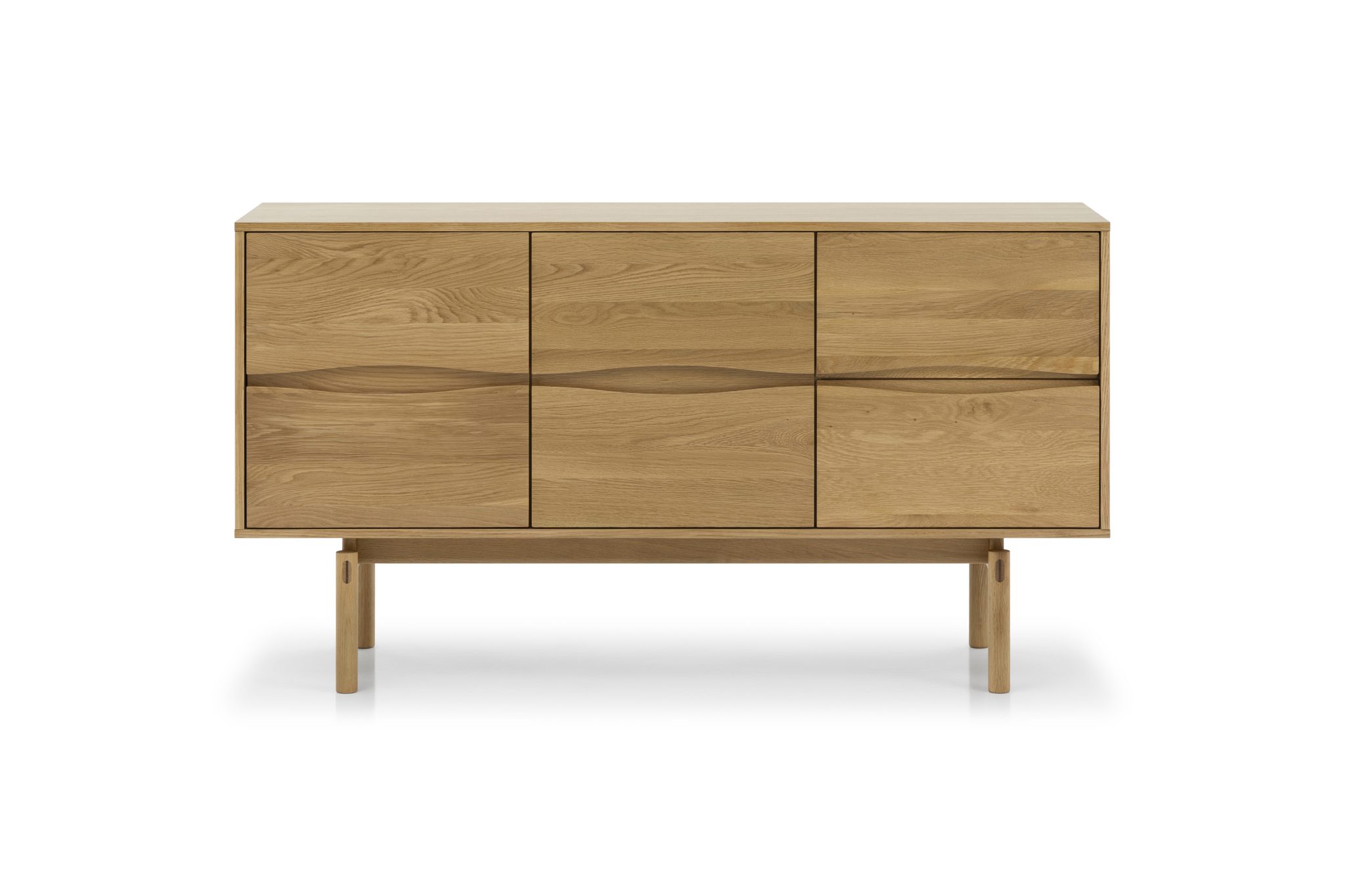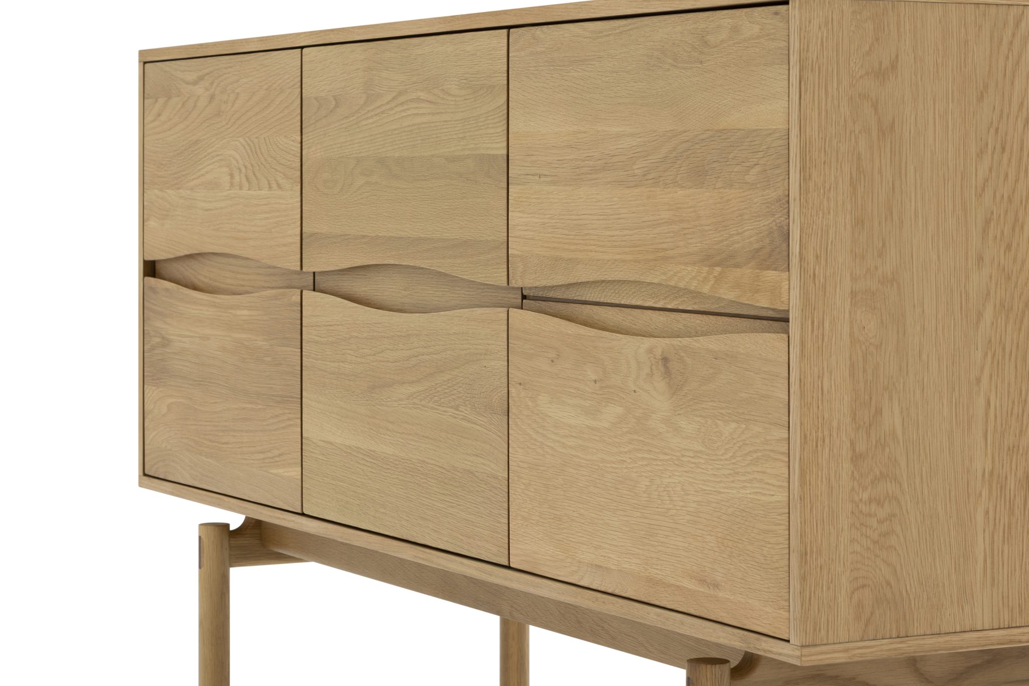 Die Fronten sind aus massivem Eichenholz gefertigt und zeigen die charakteristische Maserung, die jedes Stück zu einem Unikat macht. Hochwertige handgearbeitete Eichenholzfüße mit hohem Profil verleihen Stabilität und erleichtern zugleich die Reinigung mit dem Staubsauger. Ein mattes Lack-Finish schützt das Holz zuverlässig vor Kratzern, Feuchtigkeit und alltäglicher Abnutzung.