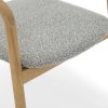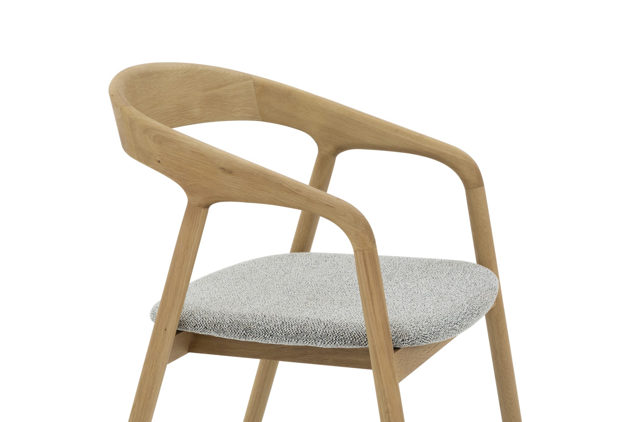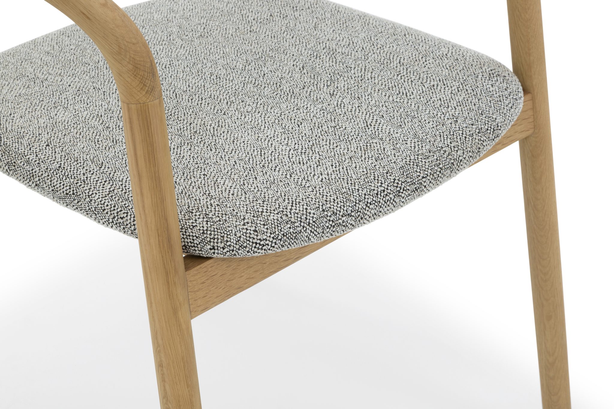 Die Sitzfläche ist mit dem stilvollen NOEL 004 Stoff bezogen – ein schwarz-weiß meliertes Qualitätsgewebe mit einer hohen Scheuerbeständigkeit von 100.000 Martindale. Dadurch ist der Stuhl nicht nur optisch ansprechend, sondern auch langlebig und pflegeleicht. Die Kombination aus Massivholz und robustem Stoff sorgt für Komfort und Beständigkeit im täglichen Gebrauch. Geliefert wird der Stuhl vollständig montiert, wodurch Stabilität und sofortige Einsatzbereitschaft gewährleistet sind.