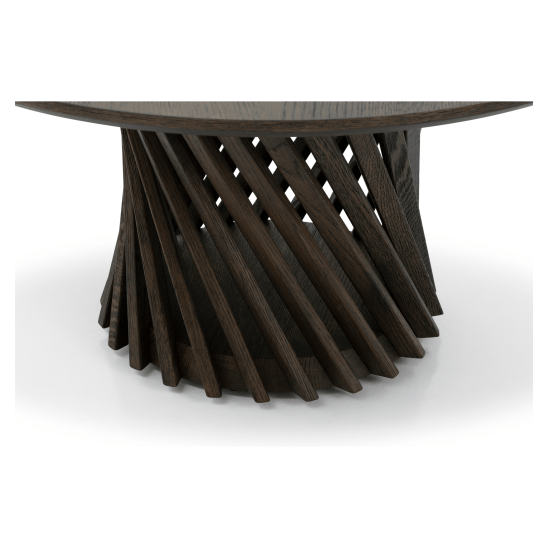 Massives Eichenholz bildet das charaktervolle Gestell, während die runde Platte aus passendem Eichenfurnier gefertigt wird. Die Espresso-Lackierung in Matt betont die Struktur des Holzes und sorgt für einen widerstandsfähigen Schutzfilm.