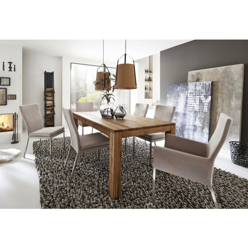 Der Esstisch besteht aus hochwertigem europäischem Eichenholz und ist mit natürlichem schwedischem Holzöl veredelt. Die Ölung hebt die schöne Holzmaserung hervor und erhöht die Haltbarkeit des Holzes.