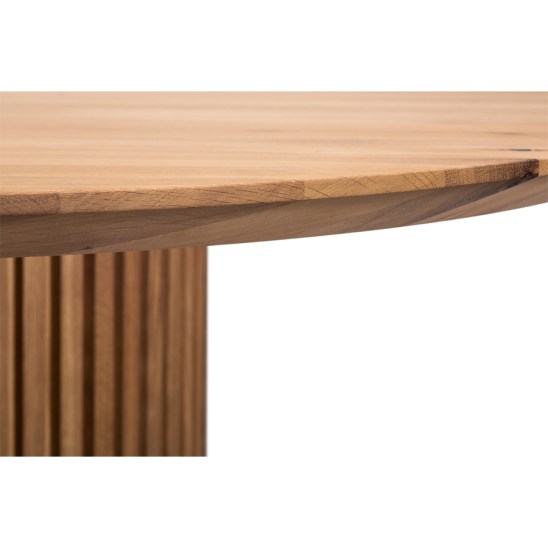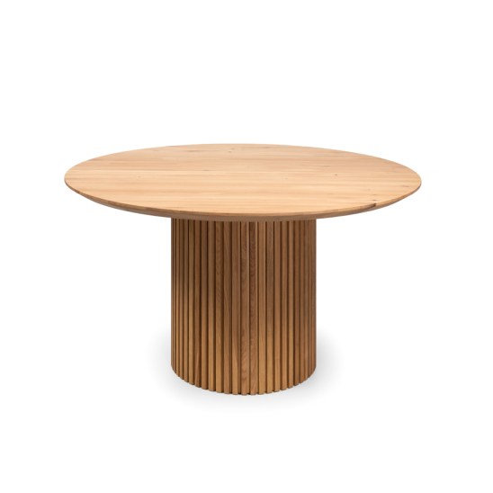 Runder Esstisch Oslo aus massiver europäischer Eiche. Der Esstisch zeichnet sich durch ein einziges massives rundes Bein aus. Um die Primatstellung des Holzes zu betonen, wird bei der Herstellung rustikales Holz verwendet. Das rustikale Holz bringt das kontrastreiche Holzbild und die Äste besonders zur Geltung. Bei Bedarf wird an den Ästen eine spezielle Holzspachtelmasse verwendet.