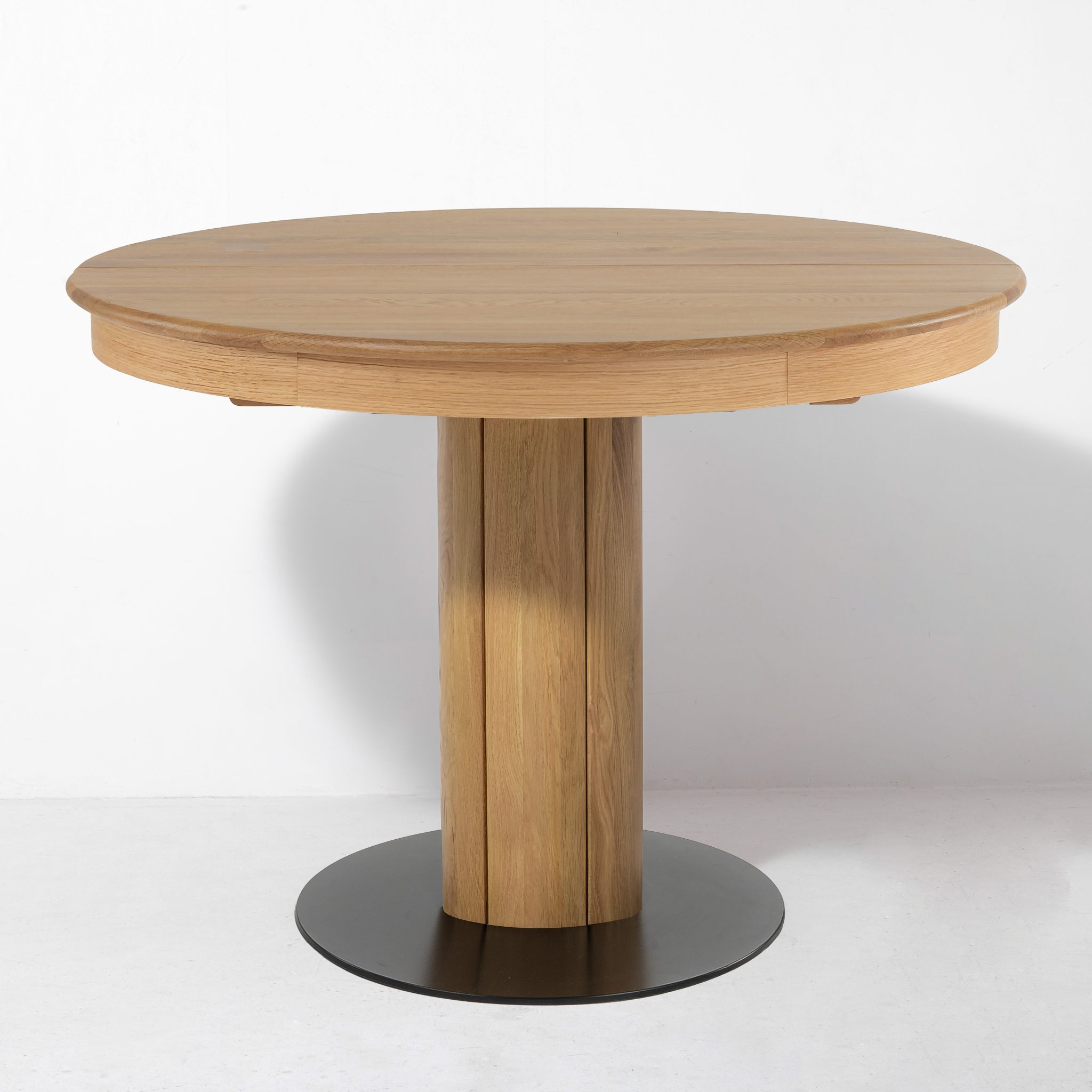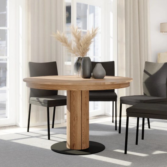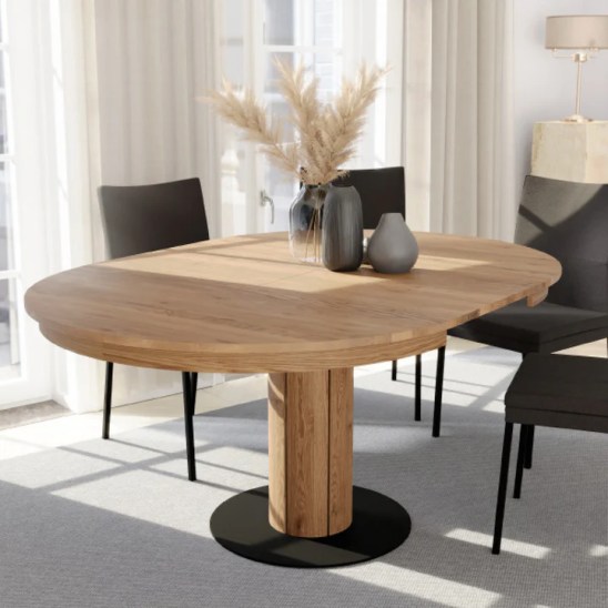 Der zentrale, runde Tischfuß kombiniert massives Holz mit einem schwarzen Metallelement und sorgt für hohe Stabilität sowie großzügige Beinfreiheit. Eine integrierte 40 cm Verlängerung lässt sich bei Bedarf einfach ausklappen und platzsparend im Tisch verstauen – ideal für Gäste oder Familienessen.