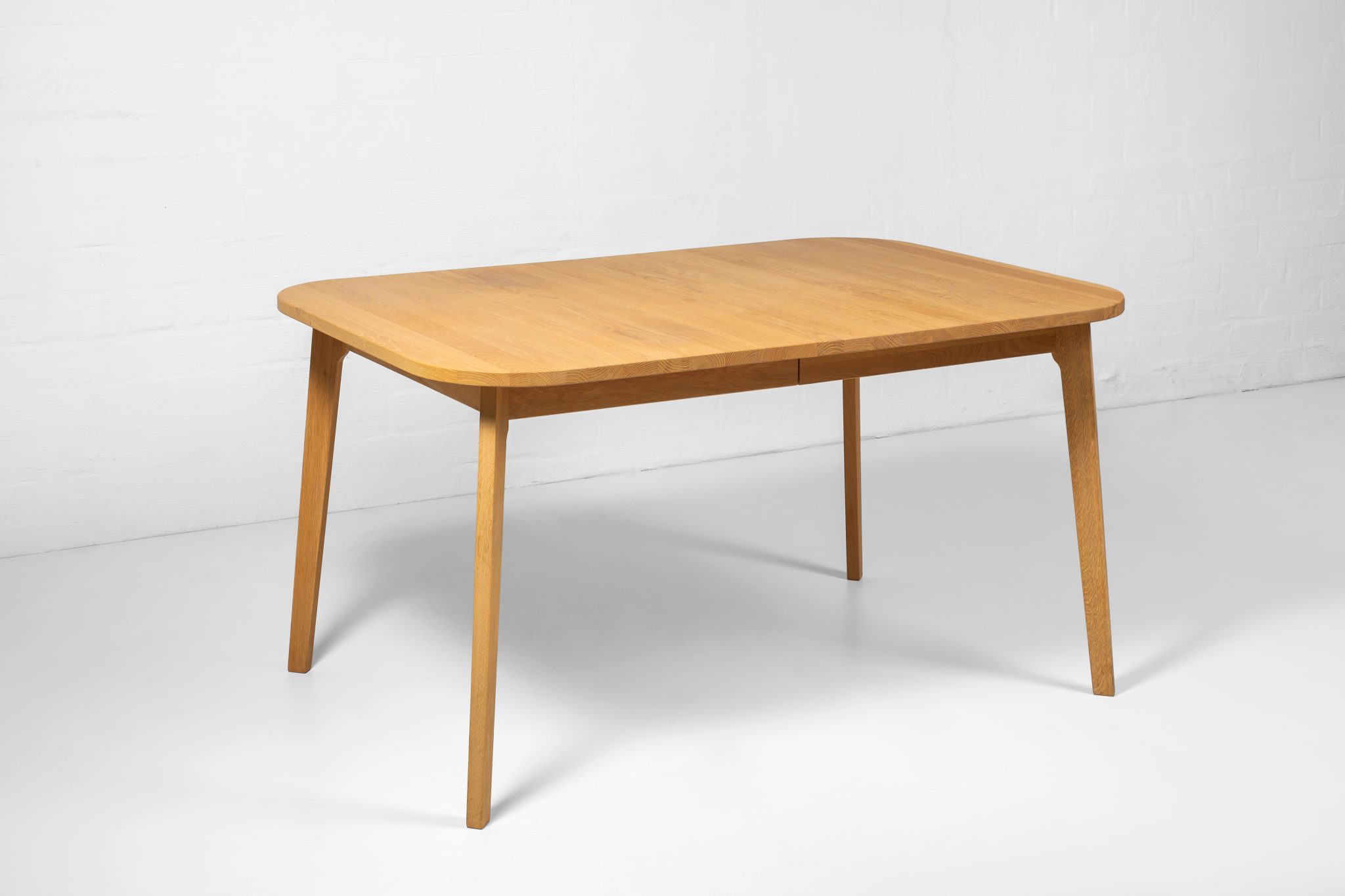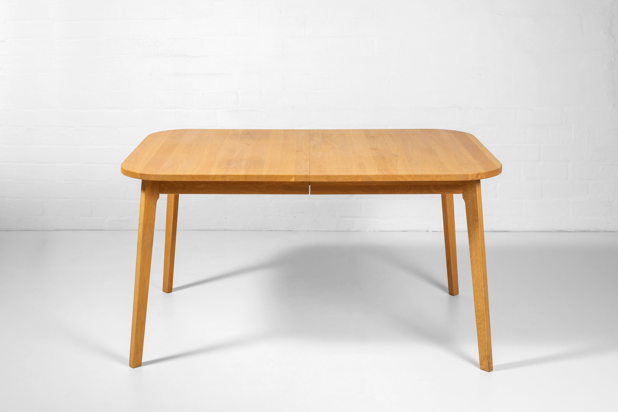 Der Tisch wird aus massiver europäischer Eiche gefertigt und mit einem natürlichen schwedischen Holzöl behandelt. Die Ölveredelung betont die natürliche Maserung des Holzes, schützt die Oberfläche und sorgt für eine langlebige, widerstandsfähige Nutzung im Alltag.
