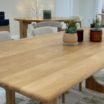 Für die Tischplatte wird bewusst gleichmäßiges, hochwertiges Eichenholz verwendet. Die Oberfläche ist frei von großen Aststellen oder Rissen und vermittelt eine ruhige, harmonische Optik. Der Tisch wird aus langen, massiven Holzbohlen gefertigt und kommt vollständig ohne Fingerzinken oder verleimte Kurzstücke aus.