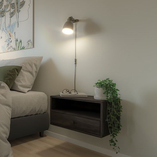 Ein moderner schwebender Nachttisch mit offenem Stauraum und einer Schublade ist eine großartige Lösung für die meisten Schlafzimmer. Funktionale Schublade, um Ihre Sachen versteckt und bei Bedarf erreichbar aufzubewahren. Offenes Regal, um Ihre Lieblingsbücher zu verstauen und zusätzlichen Stauraum zu haben. Dieses Produkt ist aus massivem europäischem Birkenholz gefertigt. Es zeichnet sich durch die Schönheit der natürlichen Holzmaserung aus.