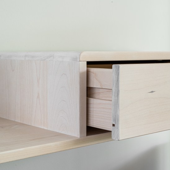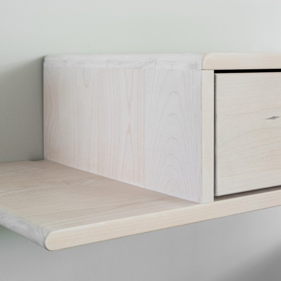 Der moderne, schwebende Nachttisch mit einer Schublade und einer zusätzlichen Ablage auf der linken Seite ist die ideale Lösung für die meisten Schlafzimmer. Die funktionale Schublade ermöglicht es Ihnen, persönliche Gegenstände diskret zu verstauen und bei Bedarf griffbereit zu haben. Die offene Ablage bietet ausreichend Platz für Ihre Lieblingsbücher und schafft zusätzlichen Stauraum. Hergestellt aus massiver europäischer Birke zeigt das Produkt die natürliche Maserung des Holzes.