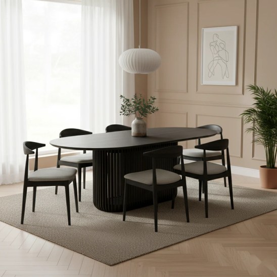 Der gerippte Vollholzfuß verleiht dem Tisch Struktur und Leichtigkeit, während die schlanke, an den Rändern auslaufende Platte visuelle Eleganz betont. Durch seine ausgewogenen Proportionen bietet Franz viel Platz für Familie und Gäste – ideal für Esszimmer und großzügige Wohnküchen.