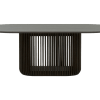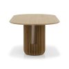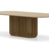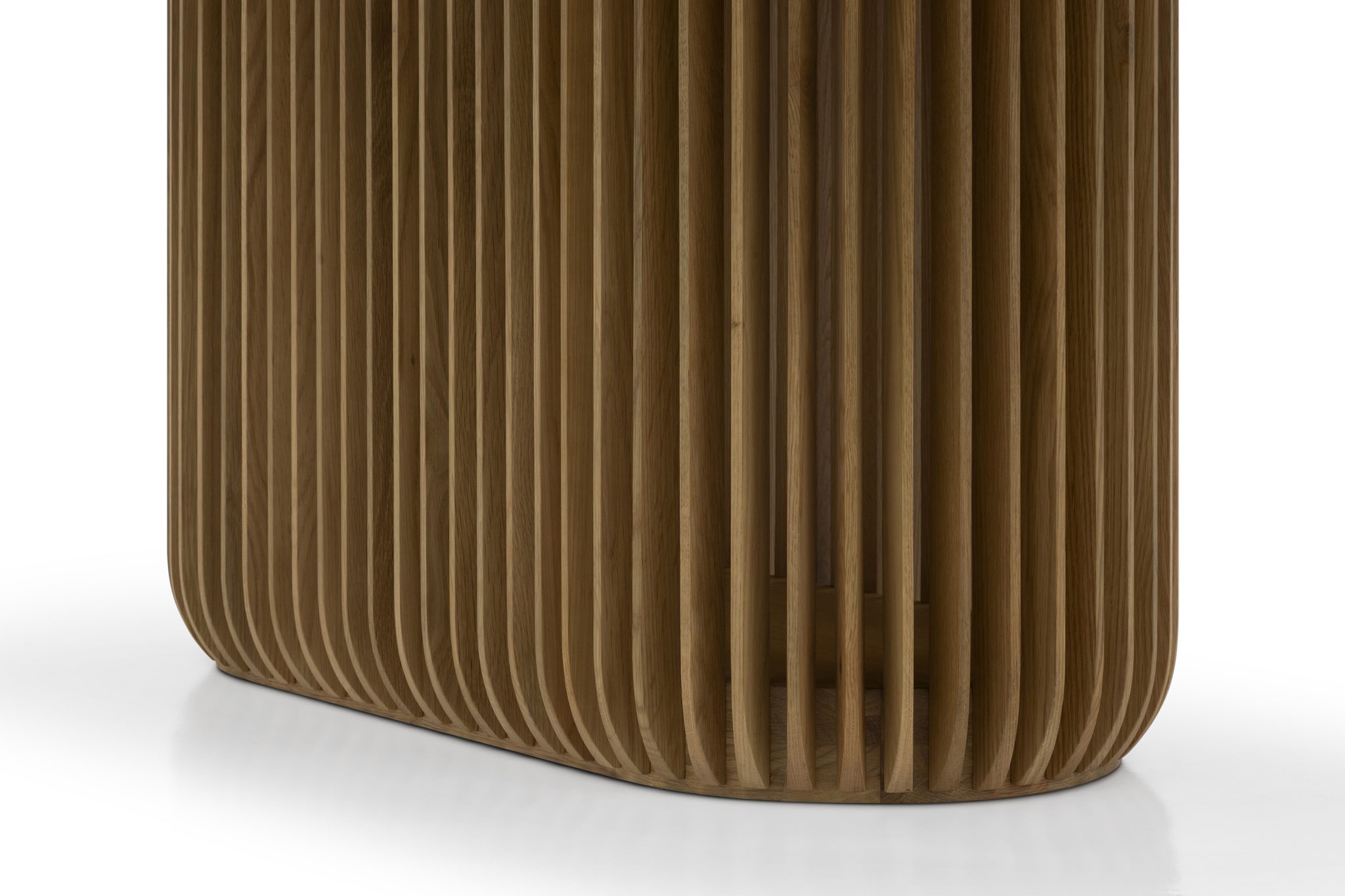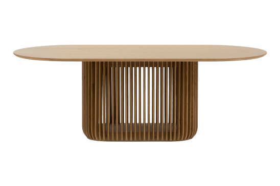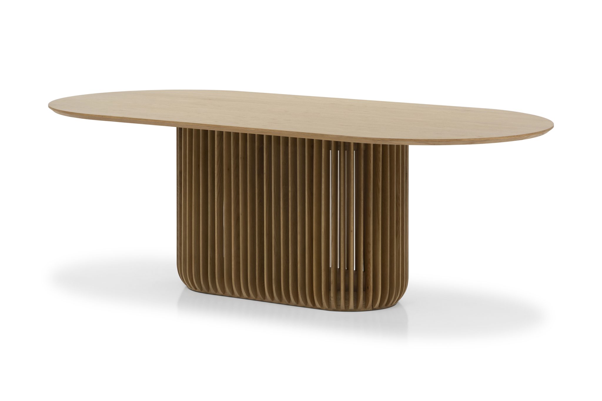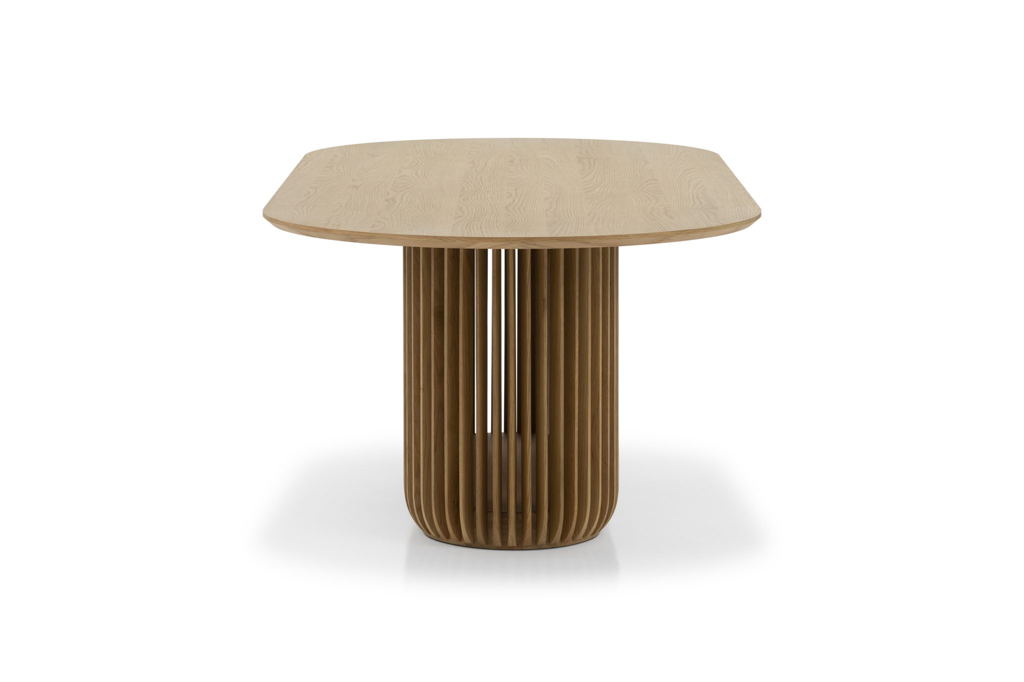 Der gerippte Fuß aus Vollholz verleiht dem Tisch Struktur und Leichtigkeit, während die schlanke, an den Rändern auslaufende Platte visuelle Eleganz betont. Die ausgewogenen Proportionen bieten viel Platz für Familie und Gäste – ideal für Esszimmer und großzügige Wohnküchen.