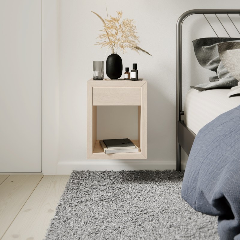 Der sorgfältig gefertigte Nachttisch aus massivem Birkenholz präsentiert sich in elegantem Weiß. Mit seinem klaren, minimalistischen Stil hebt er die Schönheit der natürlichen Maserung des Holzes hervor. Ausgestattet mit einer praktischen Einzelschublade und einer Ablage für Ihre Lieblingsbücher bietet er nicht nur im Schlafzimmer, sondern im gesamten Haus als schwebende Ablage/Schublade eine kompakte und funktionale Lösung.