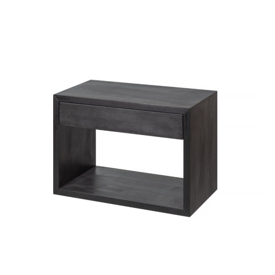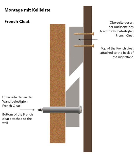 Der Massivholz-Nachttisch kann entweder auf dem Boden stehen oder als freischwebendes Wandregal montiert werden.