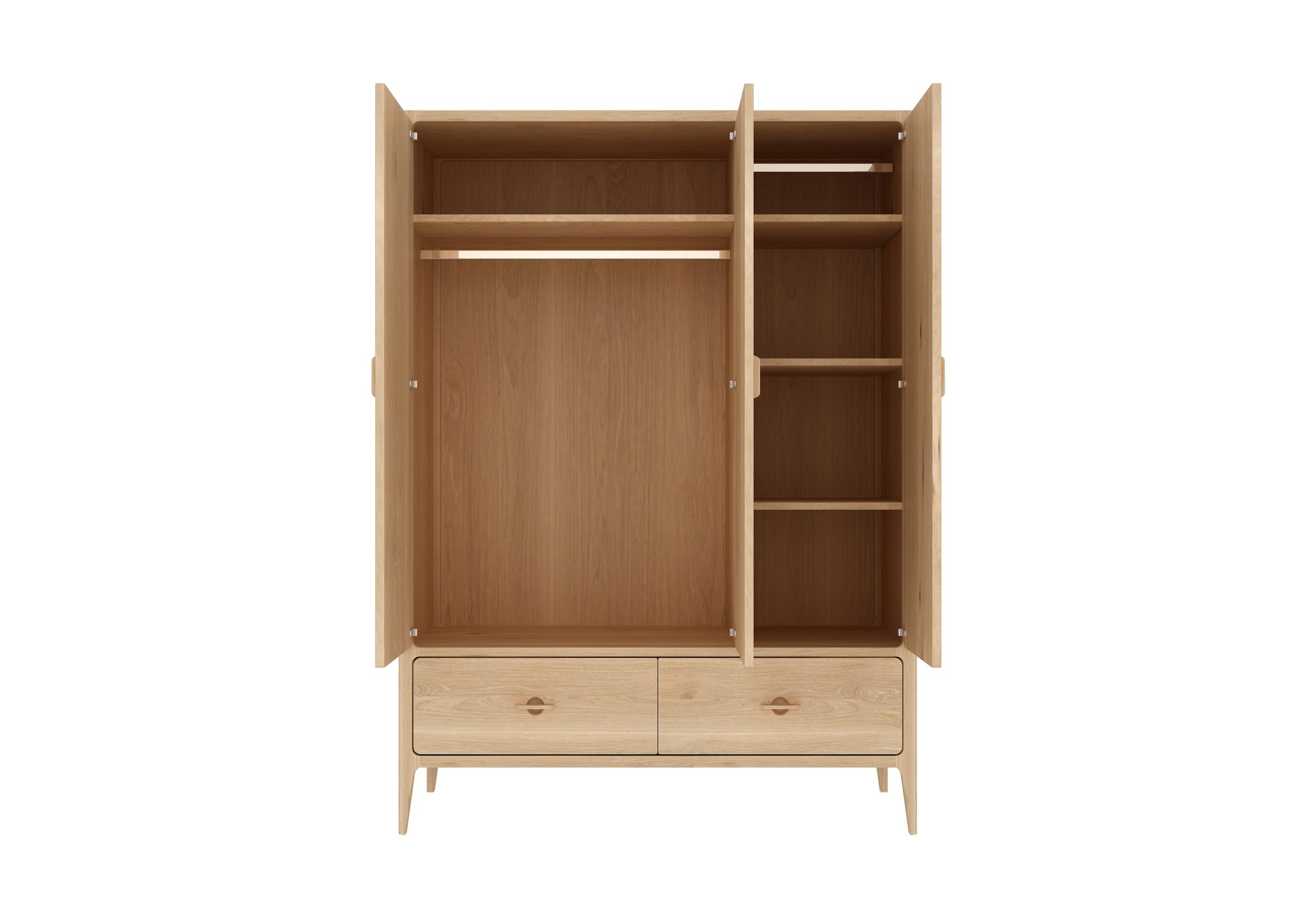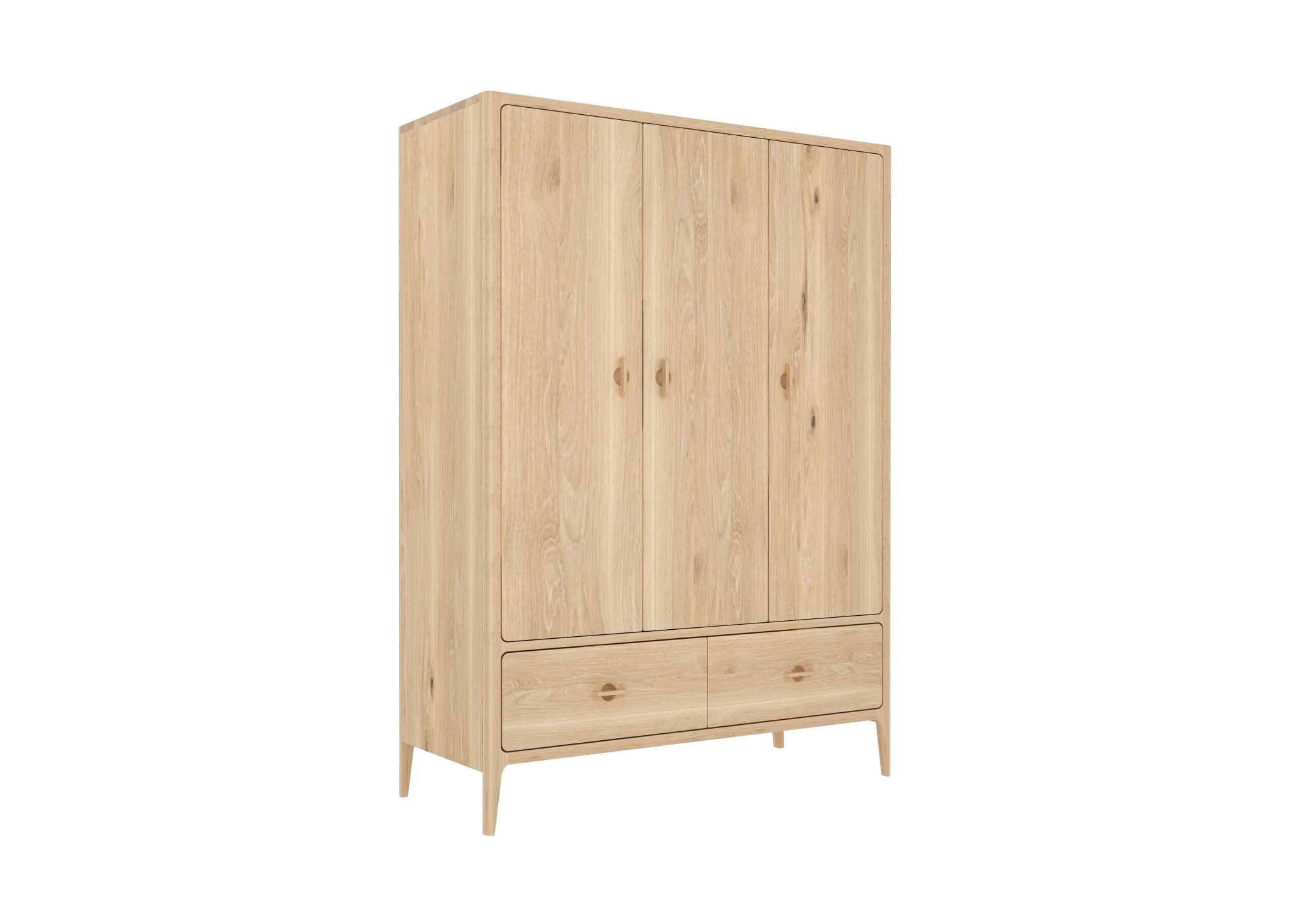 Drei Türen, eine Kleiderstange und zwei Schubladen auf Metallführungen bieten Platz für Kleidung, Bettwäsche und Accessoires. Die weichen Radien und proportionierten Fräsungen verleihen dem Schrank eine elegante, zeitlose Präsenz.