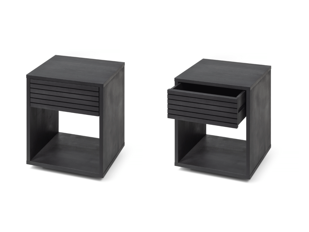 Die geräumigen Holzschubladen mit einem kontrastierenden Rillen-Effekt bieten ausreichend Platz für Ihre persönlichen Gegenstände und sorgen für eine organisierte Aufbewahrung. Die robuste Konstruktion gewährleistet Langlebigkeit und Widerstandsfähigkeit für den täglichen Gebrauch. Die offenen Ablagen unterhalb der Schubladen bieten zusätzlichen Stauraum für Bücher, Zeitschriften oder Dekorationen und vervollständigen das moderne Design dieser Nachtkommoden.