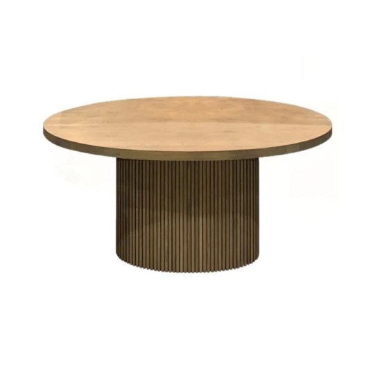 Runder Couchtisch Oslo aus massiver Eiche mit massivem Design. Der Tisch zeichnet sich durch ein einziges, massives, rundes Bein aus. Um den natürlichen Charakter des Holzes zu betonen, wird bei der Herstellung rustikales Holz verwendet, das eine stärker kontrastierte Maserung und Aststellen aufweist. Bei Bedarf wird für Aststellen eine spezielle Holzspachtelmasse verwendet. Der Couchtisch besteht aus massivem Holz, aus langen und wertvollen Holzbohlen, die dem Produkt Qualität und Wert verleihen.