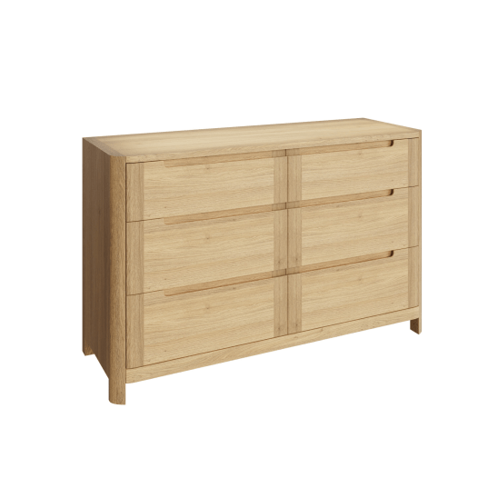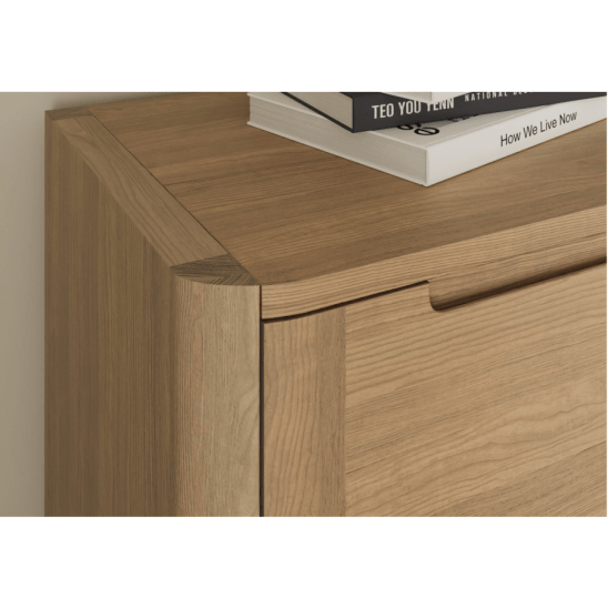 Die Kommode ist aus hochwertigem europäischem Eichenholz gefertigt und durch natürliches Eichenfurnier ergänzt. Die Vielzahl der verfügbaren Oberflächen hebt das schöne Maserungsmuster des Holzes hervor und erhöht seine Haltbarkeit.