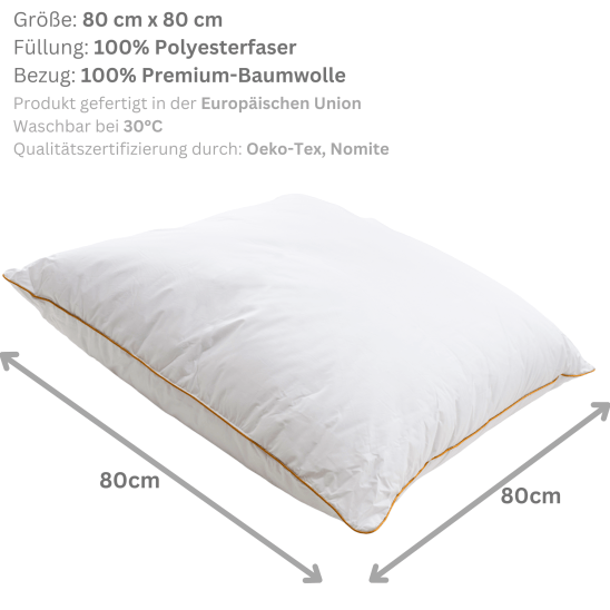 Unser Kissen ist mit 100 % silikonisierter Polyesterfaser-Daune gefüllt, die für ihre Leichtigkeit, Weichheit und Atmungsaktivität bekannt ist. Diese innovative Füllung sorgt dafür, dass Ihr Kissen immer flauschig bleibt und eine optimale Unterstützung bietet, unabhängig von Ihrer bevorzugten Schlafposition. Der Bezug besteht aus 100 % hochwertiger Baumwolle, die eine glatte und langlebige Oberfläche bietet, die sich angenehm auf der Haut anfühlt.