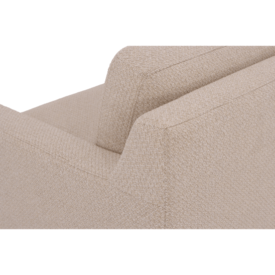Die Eichenfüße sind massiv gefertigt und mit einem matten Lack versiegelt, der die Maserung hervorhebt und Schutz bietet. Die Polsterung ist formstabil, Nähte und Kanten sind präzise gearbeitet. Das Ergebnis ist ein robustes Möbel mit ruhiger Optik.