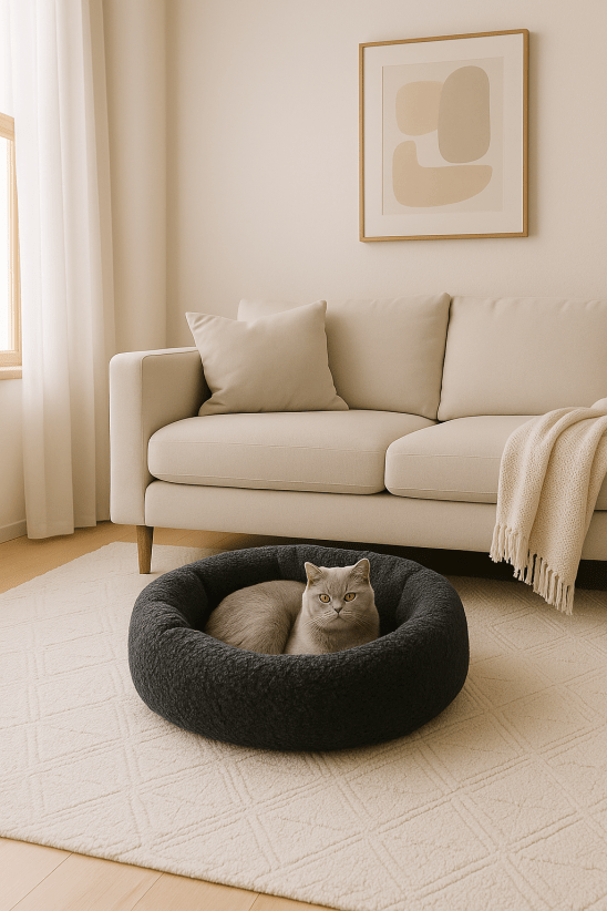 Das ergonomische Skye Haustierbett ist der ideale Rückzugsort für Katzen und kleine Hunde, die Komfort, Stil und praktische Pflegeeigenschaften schätzen. Mit seiner kompakten, runden Form (Ø 50 cm, Liegefläche 40 cm) passt es perfekt in jedes Zuhause und fügt sich harmonisch in unterschiedliche Einrichtungsstile ein.