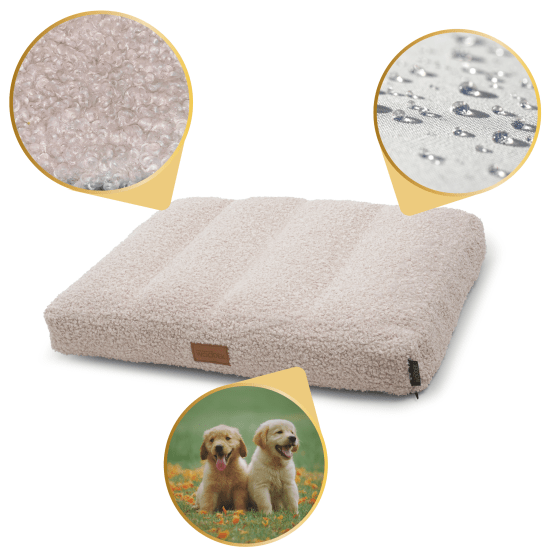 Der beige Stoff verleiht der Matratze einen zeitlosen Look, der sich in jedes Zuhause einfügt. Kratzfest und extrem langlebig, bleibt er auch bei täglichem Gebrauch stilvoll und weich, sodass Ihr Hund immer bequem liegt.
